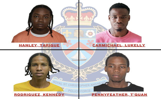 According to police, Tarique Hanley of Hull Ground, Nevis, was charged with two counts of Assault with Intent to Rob and one count of Conspiracy to Commit Robbery. T’quan Pennyfeather of Conaree Village/Monkey Hill, St. Kitts, Kennedy Rodriguez of Pine Gardens, Shadwell, St. Kitts, and Lukelly Carmichael of Morning Star, Nevis, were each charged with three counts of Assault with Intent to Rob.