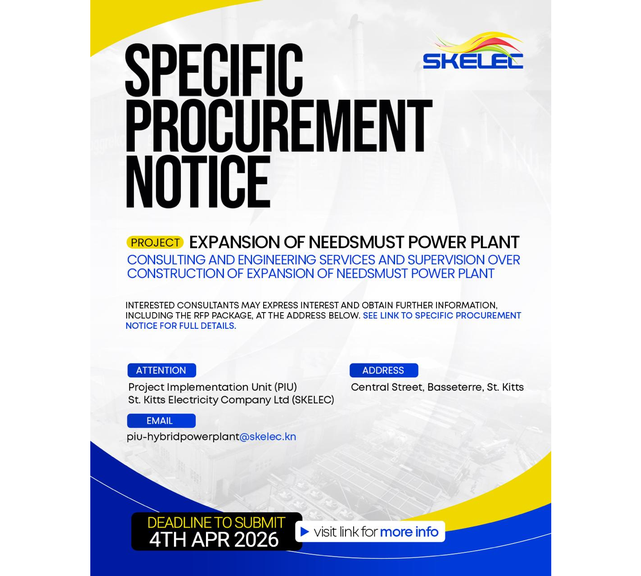Proposals must be submitted on or before April 4th, 2026, at 11:59 pm (AST) to the SKELEC Project Implementation Unit (PIU), Central Street, Basseterre, St. Kitts, or via email at piu-hybridpowerplant@skelec.kn.