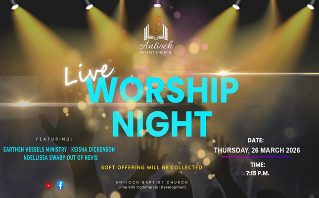 The Antioch Baptist Church warmly invites the public to a Night of Worship on Thursday, March 26, 2026, at 7:15 p.m. at the Lime Kiln Sanctuary, featuring Earthen Vessels Ministry, Keisha Dickenson, and Noellissa Swaby out of Nevis