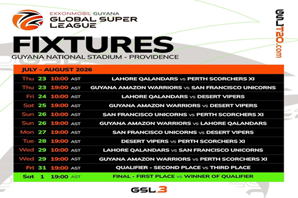 April 22nd, 2026 -- The ExxonMobil Guyana Global Super League (GSL) has officially unveiled the full match schedule for its highly anticipated 2026 edition, set to take place at the Guyana National Stadium, Providence, from July 23 to August 1, 2026.