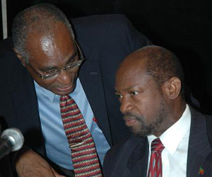 Premier of Nevis Hon. Joseph Parry (l) speaks with St. Kitts and Nevis' Prime Minister Hon. Dr. Denzil L. Douglas at the National Consultation on the Economy. |